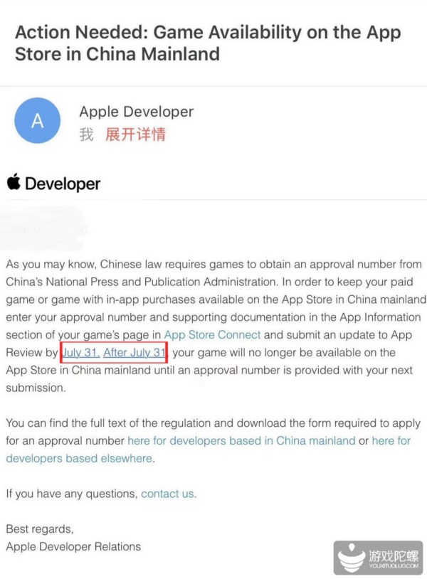 7月8日,根据苹果官方消息,7月31日之后所有无版号的付费游戏(含内购的免费游戏、付费下载的游戏)将全部从中国大陆的App Store下架,开发者可在7月31日之前提交游戏版号及其相关文件。