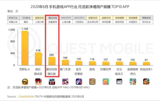 在QuestMobile今日所发布的报告中,明确指出益智、棋牌类游戏正在成为疫情之下,玩家的新宠,而在2020年6月手机游戏App行业月活跃净增用户规模Top10中,一款名为《樱花校园模拟器》的游戏以265万的MAU成绩傲居前三,作为一款日本产的模拟游戏,能够在神仙打架的国内市场占得一席之地,实在令人吃惊。