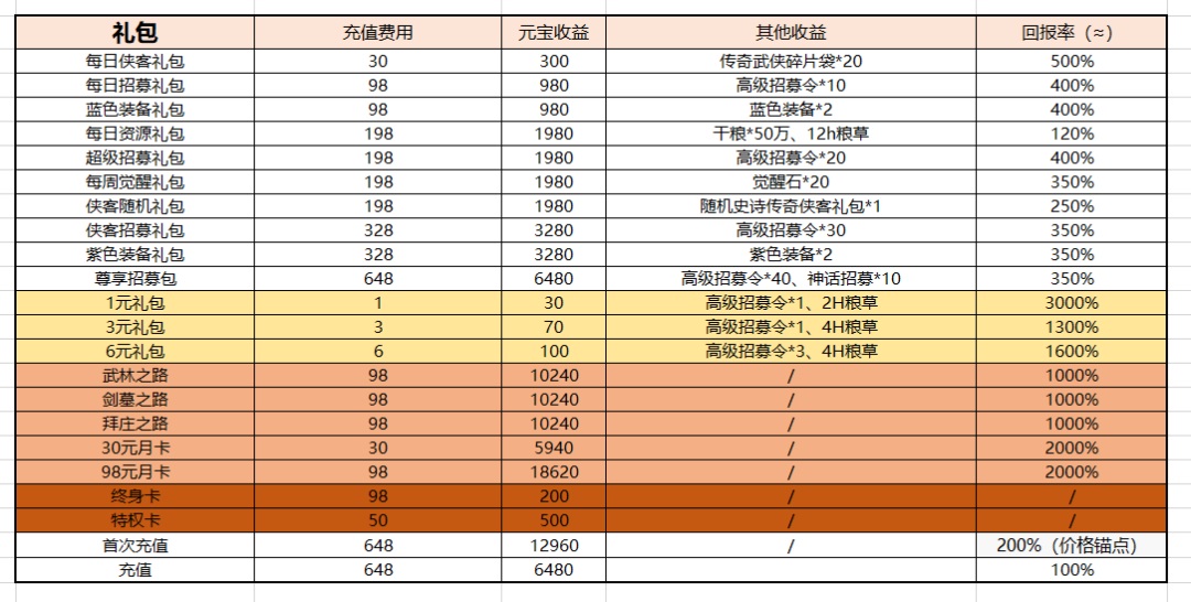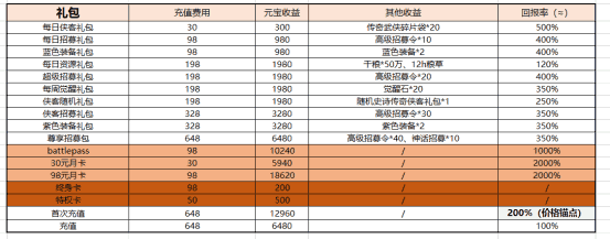 我们可以发现,月卡的元宝收益是最高的。其次是每日的1、3、6元小额礼包以及battlepass。从性价比来看,月卡最高。