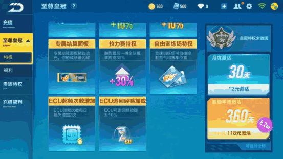 举个例子。QQ飞车的贵族卡。早期贵族卡的功能较少,只有少量外显以及防踢功能,销量并不乐观。后续新增了多个功能改善。