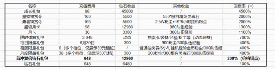 同时,从付费收益上来看,首充翻倍也就只有2倍收益。这前后巨大的差异,会不会影响中R用户的后续对钻石价值的认知,以及影响其他付费?