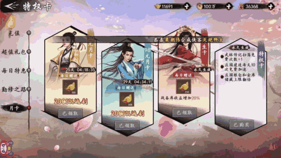 终身卡和特权卡,可以让用户扫荡关卡数加成。使得用户每天的数值收益上限更高,可以更快的成长,本质也是卖数值。这2个能够吸引追求成长的用户购买,且性价比随着玩游戏的时长逐渐提升。
