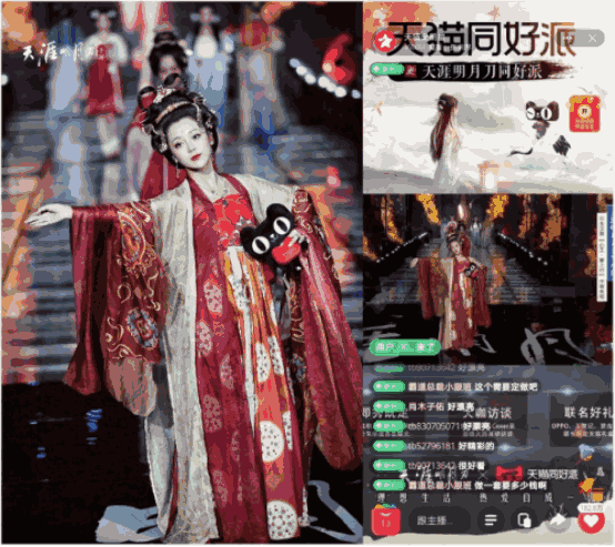 又如,在10月10日-24日,【天猫同好派】携手《天涯明月刀手游》,为少侠们带来从虚拟到现实的“天刀理想生活体验”,即天刀 x 天猫同号派,联手众多国风品牌打造了极具天刀特色的衣食住行生活体验,除天刀独家联名限量礼盒,还在十城明月华服秀上首创进行了“即秀即订”的直播和淘宝二楼好物分享,并得到了电商带货女王薇娅的推荐。