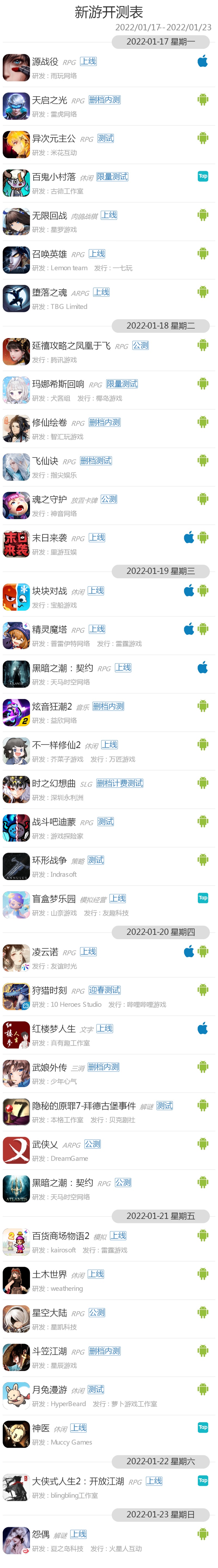 GameRes游资网统计了2022年1月17日—2022年1月23日的最新手游开测信息,共有37款游戏开测。以下是下周开测信息: