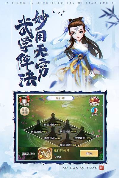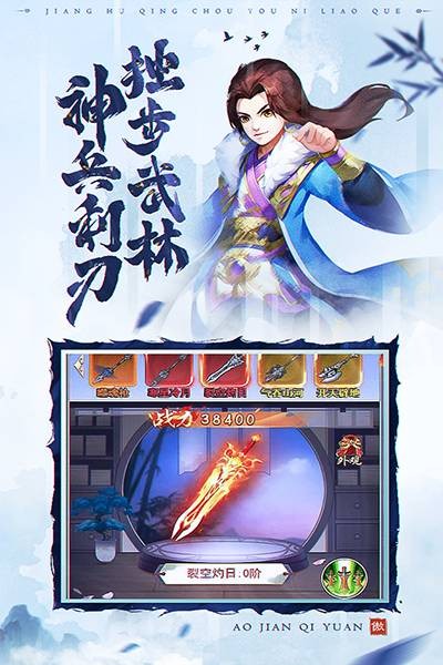 纷纷江湖路,萧萧武侠情。有人的地方就有江湖。我辈人才倍出,在江湖上呈现出了新的一场百家争鸣、八仙过海各显神通的精彩竞争。《傲剑情缘》是一款全新的以武侠江湖题材背景的RPG游戏。精美的人物刻画、丰富真实的江湖场景、热血刺激的打斗渲染,给你身临其境的直观游戏感受。天纵英才群侠出,铁血豪情论英雄。这里有上百个极具特色、风格迥异的武侠等待你的召唤,与你一起结伴而行,共闯天涯路。