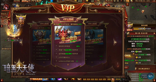 如何在游戏中简单快捷的获得愉悦感,这是《暗黑大天使》探索的主要方向之一。以轻量化设计理念为核心,满足不同层级玩家的游戏需求,游戏不同以往,大胆推出了“免费升级VIP”模式。在这一特色玩法之中,玩家无需氪金即可获得VIP,同时享有提升VIP等级的全部特权福利。玩家只需在游戏中完成对应任务,即可解锁VIP等级,创建第二、三角色、装备自动熔炼、经验加成、免费传送、更多副本次数、每周福利礼包、远程商店等功能。