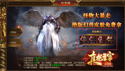 《真龙主宰之盛世遮天》是一款以东方魔幻为题材的2.5D角色扮演类网页游戏。游戏中玩家作为精通术法和各种武技,并把两者融合一体的传奇战士,在被妖兽和魔王侵袭的幻想大陆中,不断阻止邪恶势力的入侵和守护人类家园的故事,集合了BOSS无限刷,套装收集,装备合成,四大神兽幻化,神翼升阶等特点鲜明,趣味十足的玩法,让玩家体验到一个充满东方魔幻元素的幻想世界。