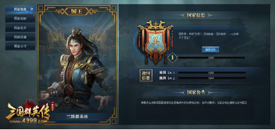 国家信息:显示本国的国王形象,本国的国家公告,以及三个国家各自的等级、经验等信息。