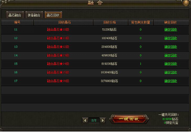 可以看见回收16级的融合晶石可以获得300多万的钻石,也就是最高8级宝石的一次大融合,那么真的有这种运气真的是钻石来的太容易了,所以建议玩家可以买1级的宝石,来慢慢进行赌石,有亏有赚,不用一下子买等级较高的融合晶石。
