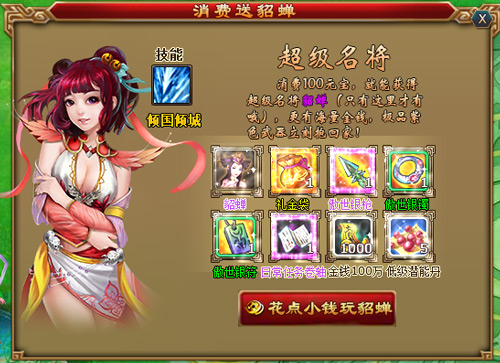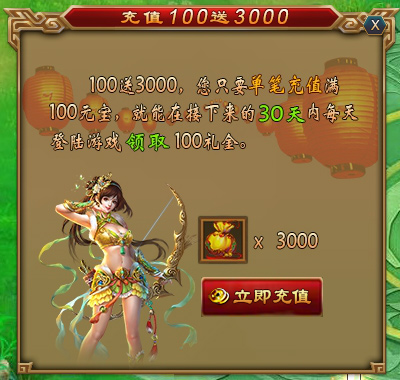 在《英豪争霸》游戏中所有玩家只需消费100元宝,就可获得官方送出的精美大礼包一份!【礼包内容】:礼金*88、30级对应职业武器、30级套装之手镯、30级套装之护符、双倍经验丹*1、日常任务卷轴*1、铜钱符*1000、貂蝉、低级潜能丹*5。