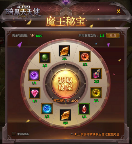 通过攻打据点、目标奖励和排行榜获得的功勋值,可以在魔王秘宝中抽取各种珍贵奖励;魔王秘宝转盘采用不放回的抽奖方式,抽取完所有奖励之后会重置转盘,玩家也可以选择手动重置转盘;