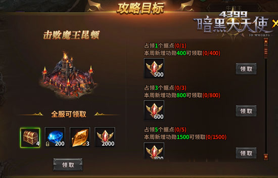 1) 本服所有玩家可以在魔王大陆上攻掠魔王及其爪牙的据点,每占领一个据点,所有参与玩法的玩家均可以领取一份通关奖励;