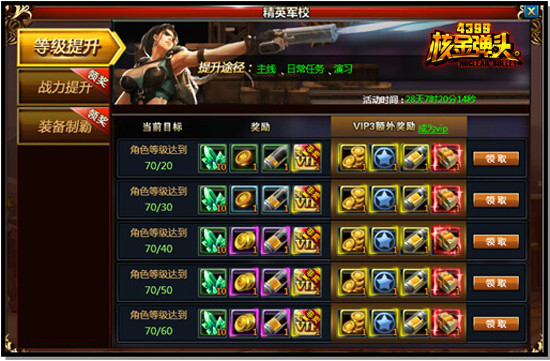 当玩家等级达到一定要求后,可以领取对应档次的奖励,VIP3的玩家还可以领取额外的奖励。