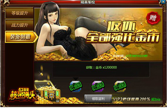 当全身装备强化到一定品质的时候,会返还全部强化所消耗的金币,VIP3的玩家更可返还200%的金币。