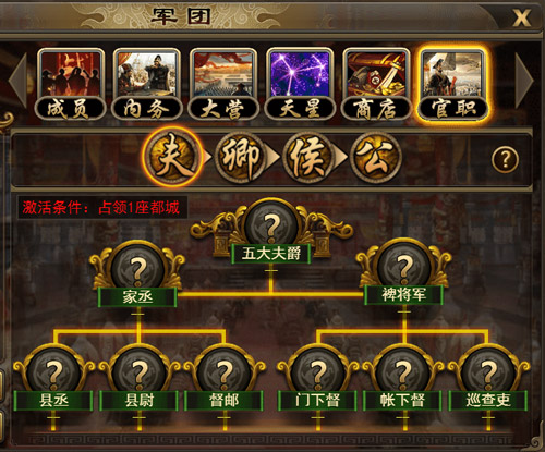 6.军团官职:军团占领都城之后即可激活对应体系的官职,担任官员虽不能直接获取铜钱,但官员会提升大量封地铜钱产出量。7.军团宝库:军团宝库会根据军团占领城池数量及规模产出各类宝箱,使用令箭即可进行夺宝,宝箱中会产出大量铜钱及粮草。