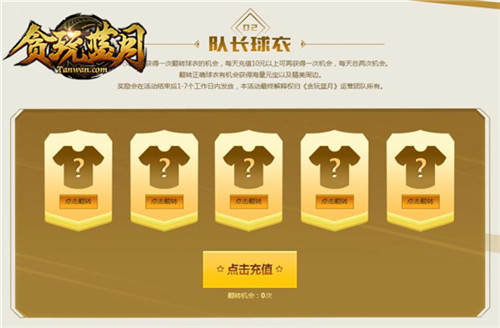 想要拥有用款传奇队长球衣吗!玩家每天都有一次翻转球衣的机会,翻转到正确球衣就能获得海量元宝以及精美周报。而且每天充值10元以上可再获得一次机会,但是每天总两次机会。想知道欧文的宝藏球衣藏在哪里了吗?