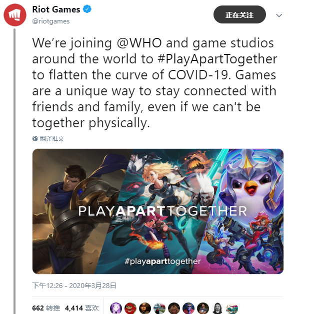 近日,世界卫生组织(WHO)联合多家游戏公司发起了“PlayApartTogether”抗疫活动,包括多个游戏内的特殊活动、独家内容、奖励等等,鼓励人们宅在家游戏。 这也是标志着游戏主流化的一个重要时刻,随着人们被隔离在家,没有机会进行户外活动,游戏变得更加流行。对于世界卫生组织来说,这也是一个转机,去年世卫组织还将“游戏成瘾”列为可以临床治疗的疾病。 目前,已经有动视暴雪、Riot、Unity、Amazon Appstore、Youtube、Twitch等多家公司参与。 首批响应游戏公司如下: 动视暴雪 Amazon Appstore Big Fish Games Dirtybit Games Glu Mobile Jam City Kabam Maysalward Playtika Pocket Gems Riot SciPlay Snap Games Twitch Unity Technologies Wooga Youtube Gaming Zynga 新型冠状病毒对游戏行业的影响