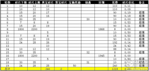 因此,我们大体可以认为,在第一档花费(1000金左右)珍宝冲刺活动对于10珍的黄宝碎片和紫宝碎片的性价比都在5金/碎片左右。