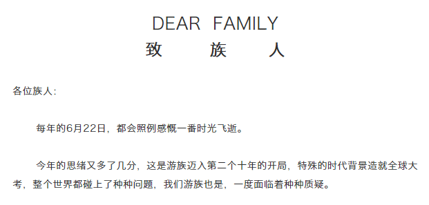 6月22日,游族网络董事长兼CEO林奇发表了一封致游族人的信。
