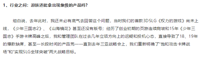 对于游族而言,产品荒的出现虽让公司放缓了前进的步伐,但也是一次良机——过去这位少年的冲劲太猛,加速太快,所以他偶尔会过于专注眼前的道路,没有太多时间用于思考。