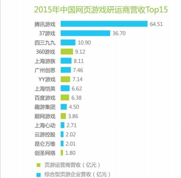 丁三石曾经在员工大会上信誓旦旦地说,网易绝对不会去做页游和手游,这样会影响公司员工的价值观(现在打脸打得啪啪响)。所以,相对于端游市场上的腾讯和网易两大垄断,页游市场上的老二换成了三七互娱。下图是2015年中国网页游戏营收TOP15: