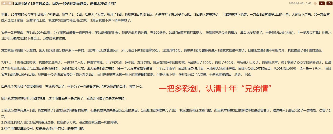当然这件事情确实管理也存在一定的难处。因为如果这个团长直接把这把多彩剑以400分给了这位十年老玩家,那么一团里的其他成员必然心有不甘,尤其是和他竞价的“新人”。恐怕那时候论坛就不是“一把多彩剑,退出十年公会”,而是一个“团长十年好友从未参团,自带500分毛走多彩剑”的故事了。
