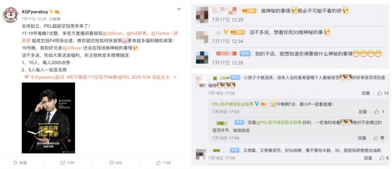 在PEL职业选手关于717空投节微博内容下,“期待FLAG”“想看伞兵与4AM33Svan会做什么”成为重点讨论内容