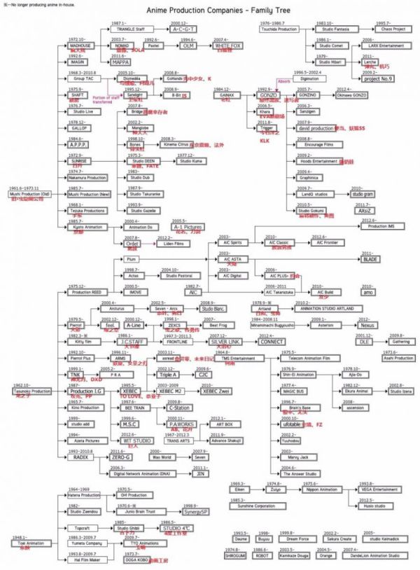 上图是日本动画公司的关系表。可以从图中看到,基本目前的所有日系动画公司大部分是由 东映系 虫制作系 龙之子系 这三个元老级动画公司细分出来的。有的走向了小清新风格,有的走向了机甲风格,有的则专注于热血动画。