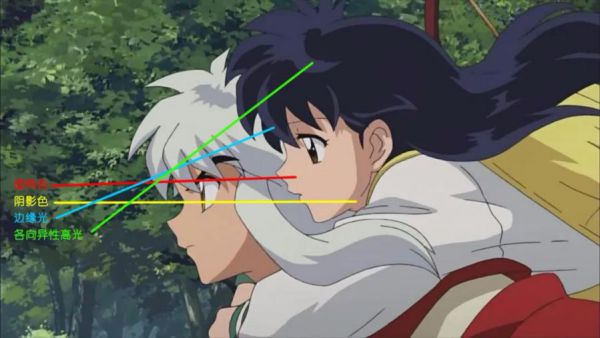通过《犬夜叉》动画中可以看出,除了瞳孔或光滑表面有高光外,根本就很少高光,并且头发的各向异性高光和边缘光合在了一起: