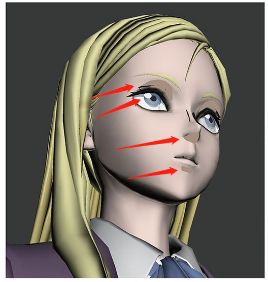 《高分少女》中的的五官除了鼻子都是贴片制作的,这就会导致侧面会穿帮,许多游戏中也是使用的贴片的方式来绘制五官。这也需要对不同角度的五官面片进行换图和扭曲操作。