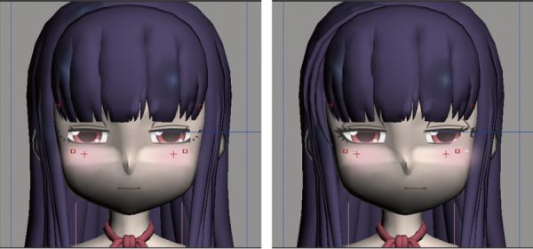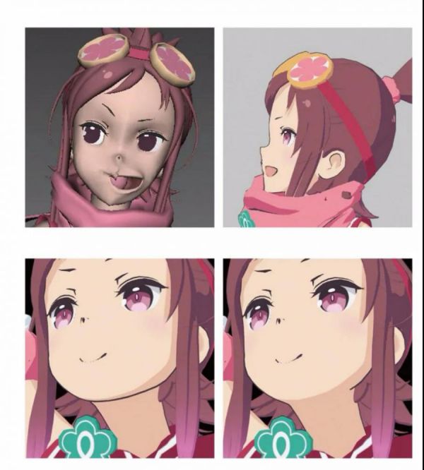 还有一种模型的变形是为了修正3D模型在面部表现方面还原二次元的时候的侧颜的扭曲感。因为卡通漫画或动画的造型往往是不符合真实的,只要在不同的角度看起来美型就好。但是在3D模型建模的时候往往正面看起来正常,侧面看起来就歪了,所以要进行变形。在游戏中可以使用BlendShapes或其他方法事先把模型在各个摄像机角度的变形调节好,然后再通过运算来对齐效果。