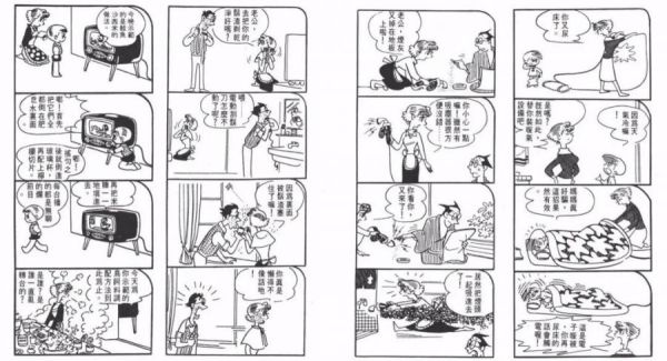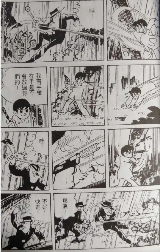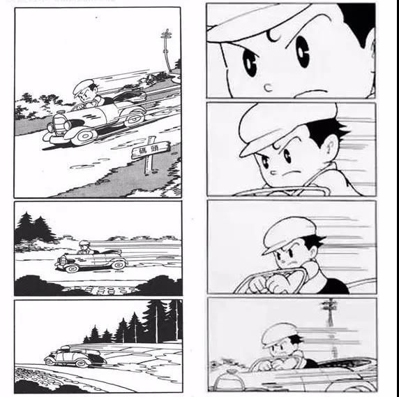 我们可以从上图手冢的漫画来出当时手冢的画风,对线条和形状是高度概括的。线条在保持流畅性的同时有时在转角处会断开,这种不是完全连接上的线条实际上人眼会自动对其补完,不会有生硬的断开感,有时反而效果会更好。还有从《新宝岛》图中的汽车可以看出速度线,结合拉长变形的车身会使画面形成强烈的动感。手冢通过不断的尝试,设计出的大眼睛,小鼻子小嘴的卡通形象非常可爱。