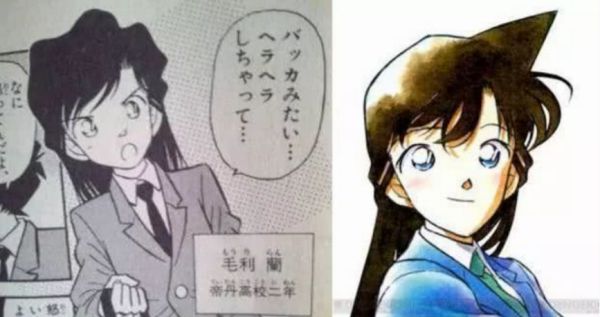 《名侦探柯南》中由于画风变化,小兰等角色的头上逐渐长角,眼睛的风格化高光风格也定型了。