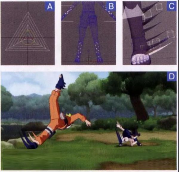 为了表现物体高速运动的速度感,物体表面的轮廓会发生类似于速度线的变形。《罪恶装备》和火影忍者中使用的是插入模型的方式进行制作的。