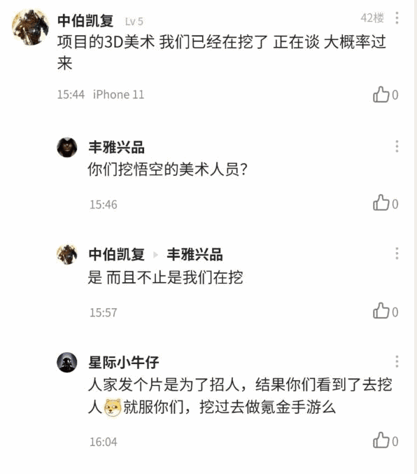 另外这期间还爆出一些猎头、HR开始对制作团队挖角的料。但正如灵游坊CEO梁其伟所言,挖人这事实属于损人不利己的事,1.核心主创本身就是股东创始人很难挖,2.挖一两个人过来对于自己项目的提升是微乎其微的,3.被挖走的人在更换项目后也很容易走偏,水平也跟下滑,遇上恶性挖人攻击的情况,更是血亏。