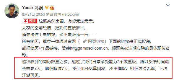而现在游戏科学他们受到的新鲜简历,早已爆棚了。