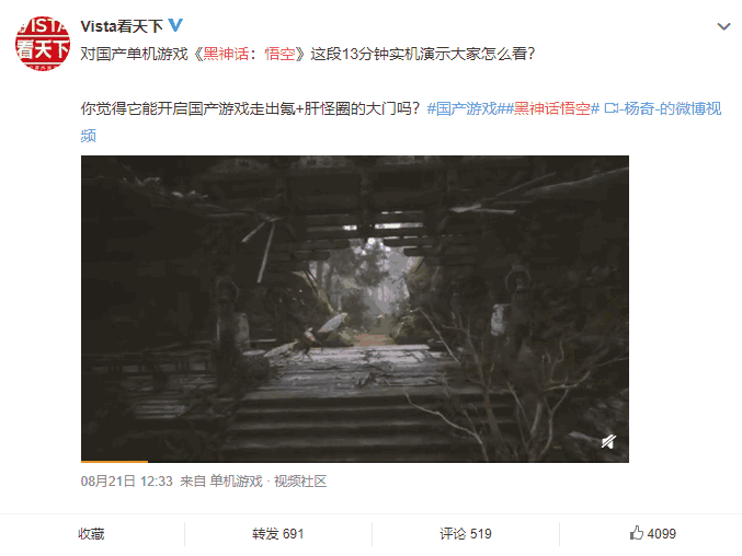《黑神话:悟空》的热度在这短短的三四天里,已经从一个千万播放量的视频发酵成了一场游戏圈的万众狂欢。