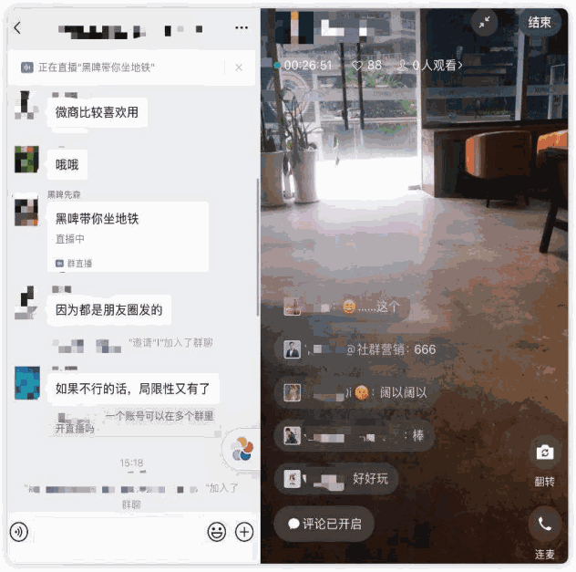 正式直播之前,可以修改直播主题,直播开始以后,直播链接便会自动分享到群聊,但链接无法转发,直播期间支持连麦、评论、点赞等互动。