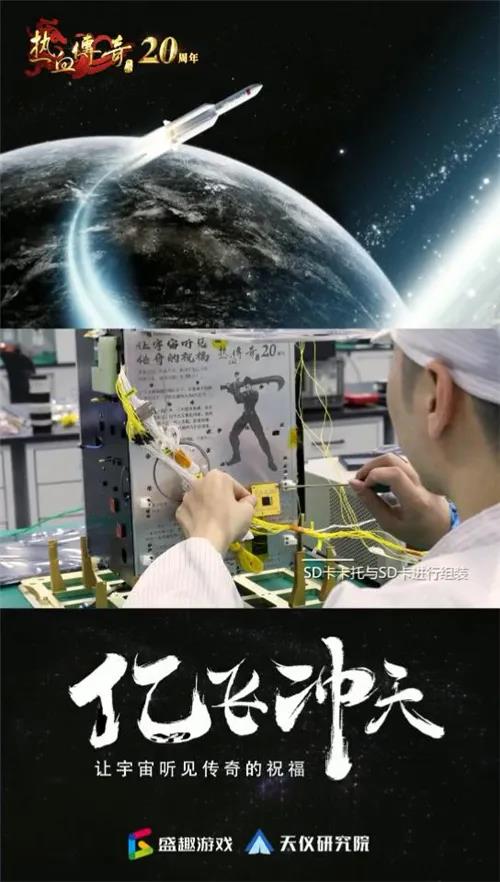 卫星装载的SD卡中,不光刻录了1亿玩家的游戏ID,还存储了盛趣游戏CEO唐彦文于《热血传奇》20周年之际发表的公开信以及《热血传奇》明星行会会长的祝福视频。这些信息将随火箭一同步入万丈星辰,让全宇宙听到传奇的声音。