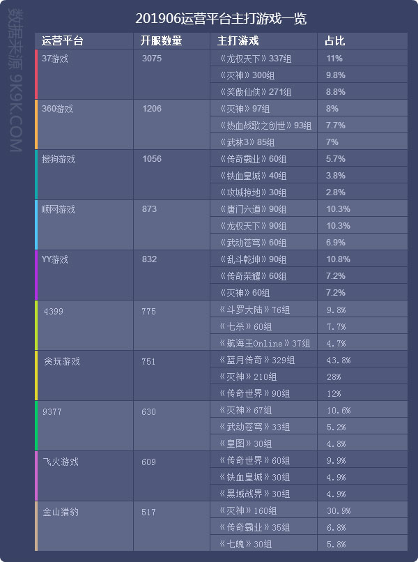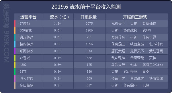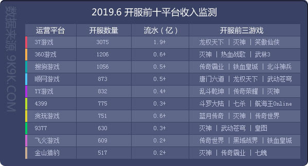 点评:本月开服前十平台流水较上月变化不大,37游戏继续以较大优势领跑榜单,旗下热点游戏本月表现不俗。其余各平台开服策略未发生显著变化,流水收益方面也较为稳定,波动不大。