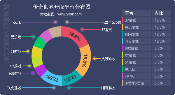 点评:本月《传奇世界》开服总数较上月缩减5.1%,但整体开服形势相对稳定,在各平台占比情况保持不变。
