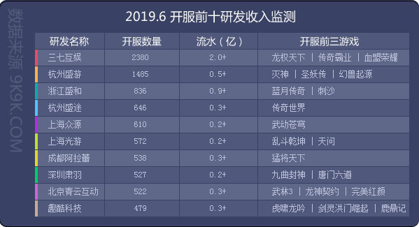 点评:本月开服前十研发流水收益情况与上月相比变化不大,榜单前三研发:三七互娱、杭州盛游、浙江盛和。