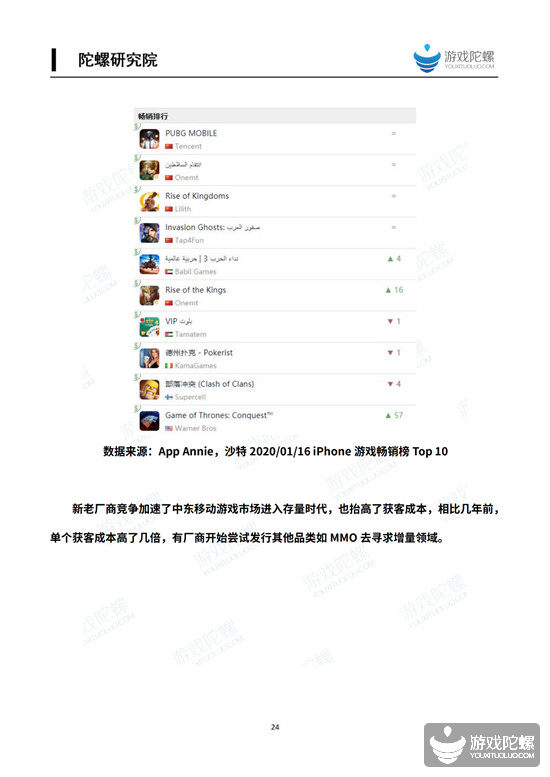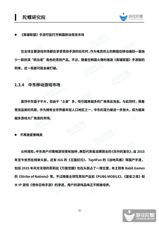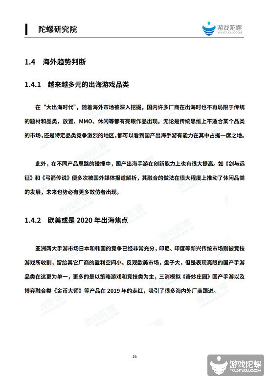 我们判断,鉴于休闲融合类产品的持续爆发以及美国市场的巨大增幅,以美国为代表的欧美或是2020年国内出海厂商关注的焦点。至于亚洲两大市场——日本和韩国,虽然存量竞争激烈,但热度高涨,比如韩国,过去一年出现了好几款国产手游爆款,受此刺激,2020年出海韩国的国内厂商数量可能要翻一倍。而中东是全球拥有最年轻人口的地区之一,在竞技品类的培育下,中东用户不再独爱策略类,潜力被进一步放大。
