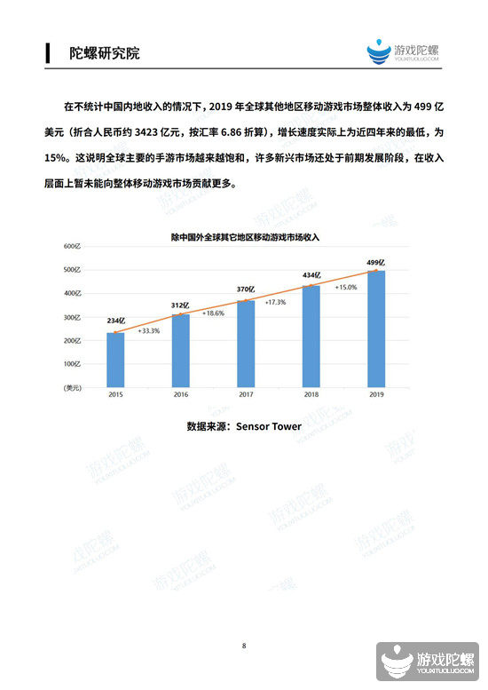 从整体规模看,在不统计中国内地收入的情况下,2019年全球其他地区移动游戏市场整体的收入为499亿美元(折合人民币约3423亿元,按汇率6.86折算),增速虽然为近四年来的最低,但依然保持高速增长,达到15%。