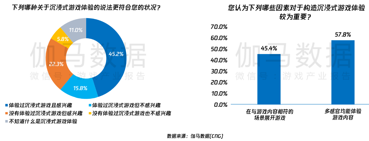 今年,游戏与新兴领域包括AR、VR、云游戏等强联动,进而引得了不少资本进驻,因此,《报告》提出科技创新将为产业创新发展提供技术支撑,并持续拓展产业发展上限的观点。其中VR、AI、云服务等成为关键。伽马数据显示,有约7成的游戏用户关注沉浸式游戏体验。