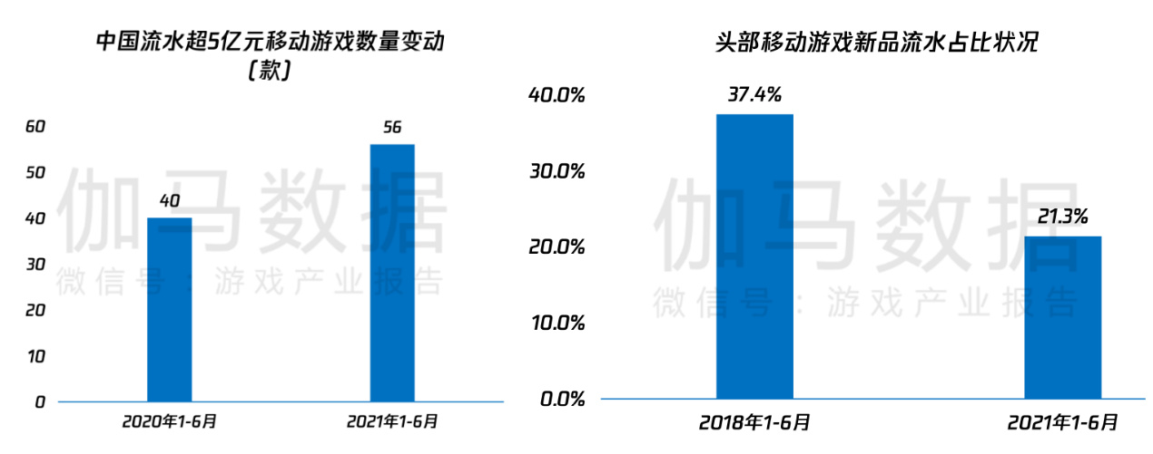 在产品层面,上半年国内有56款移动游戏流水超5亿元,较2020年同期的40款增加了16款。新品上,由于用户成熟的游戏赛道企业布局众多,且市场容量趋于饱和,新品突围难度相比于往年显著提升。今年上半年新品流水占比仅有21.3%。