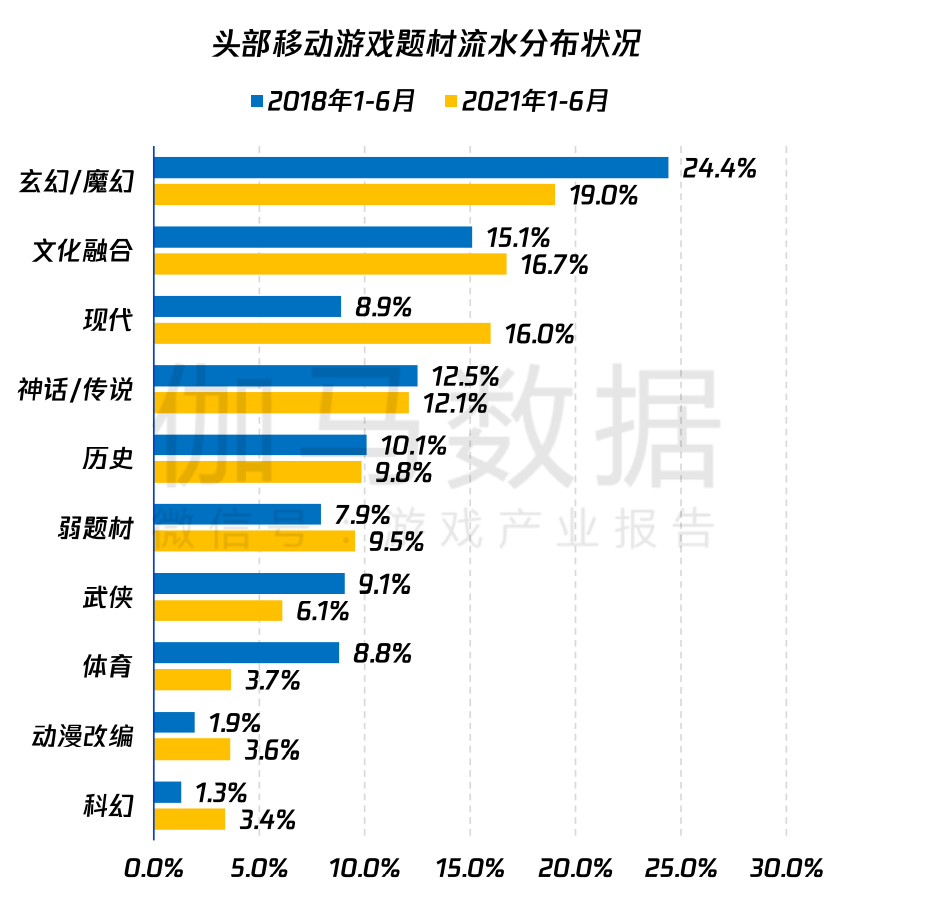 游戏题材方面,数据显示,玄幻、魔幻、文化融合、神话、传说、历史等传统题材仍然占据较高流水份额。其中,玄幻、魔幻类游戏流水占比达24.4%,文化融合类占比达15.1%。