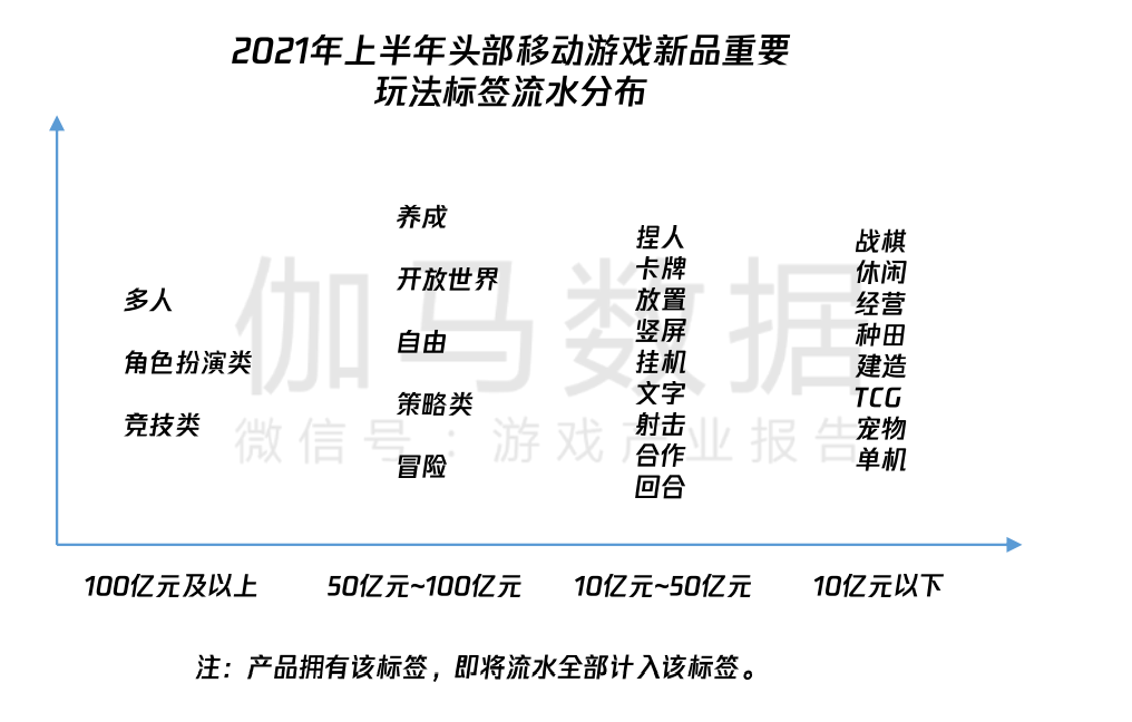 3、2021年新品突围难点提升,上半年新品流水占比仅有21.3%,且头部新品的标签略有变化,从古风、三国、体育为主演变为养成、自由、开放世界;