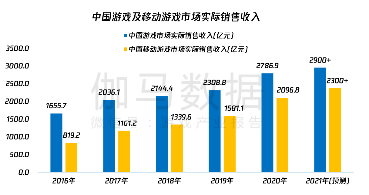 据伽马数据统计,2021年中国游戏市场实际销售收入预计将超2900亿元,较去年全年2786.9亿元有所增加。其中,移动游戏市场收入有望达到2300亿元,与去年同期相比增加300亿元。