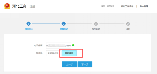用户注册信息按照提示要求进行填写,信息填写完成后点击【下一步】按钮,进入邮箱验证页面,输入一个可用的邮箱,点击“获取验证码”按钮,系统提示验证码已发送,然后打开邮箱,找到验证码,在下图的验证码一栏输入邮件中的验证码,即可。